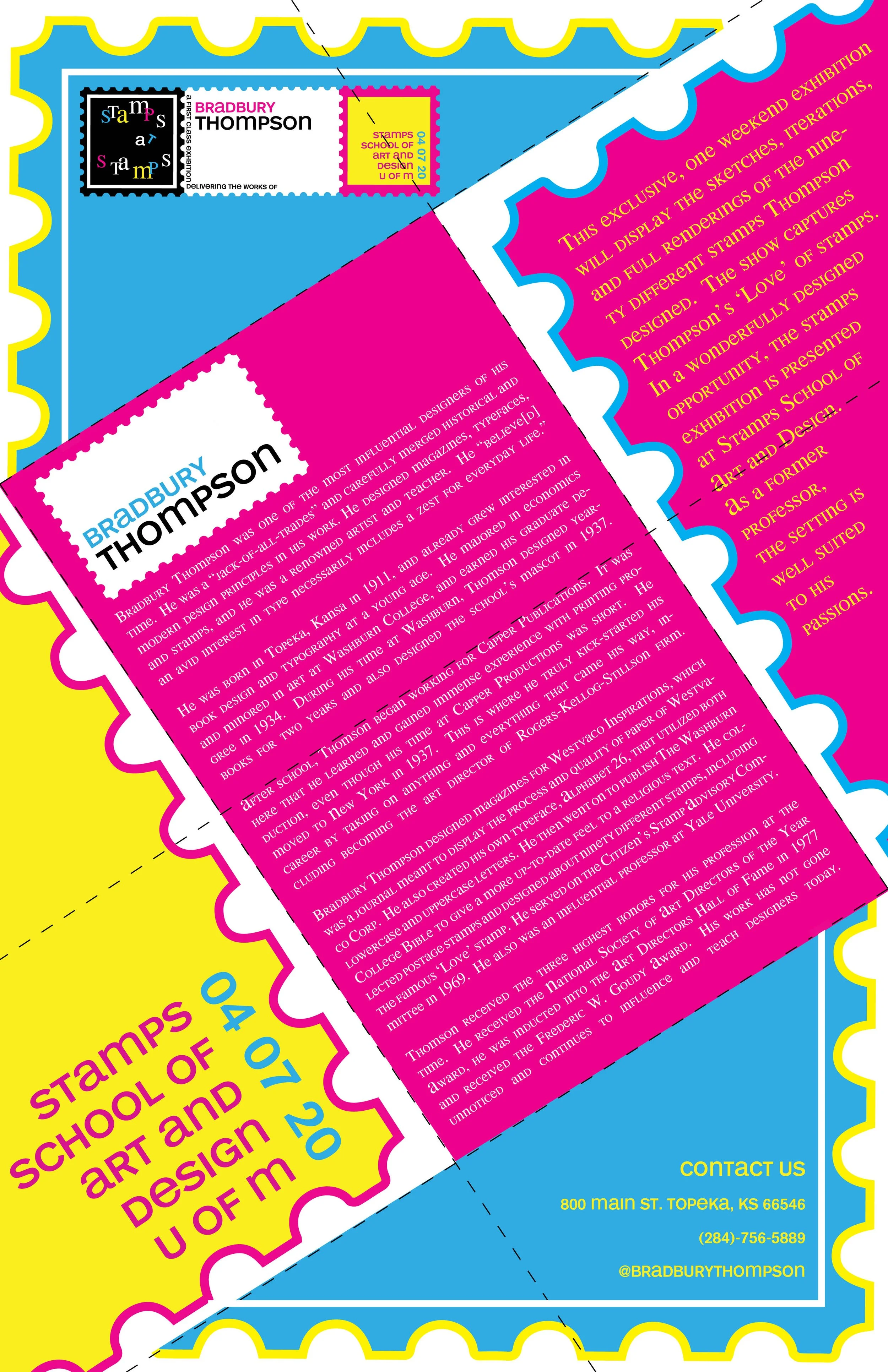 I created a branding package to promote a hypothetical exhibition featuring the works, specifically the stamp designs, of designer Bradbury Thompson. By studying Thompson’s iconic works, maintaining consistency throughout design elements, and using typography, color, and texture, I was able to design promotional materials.