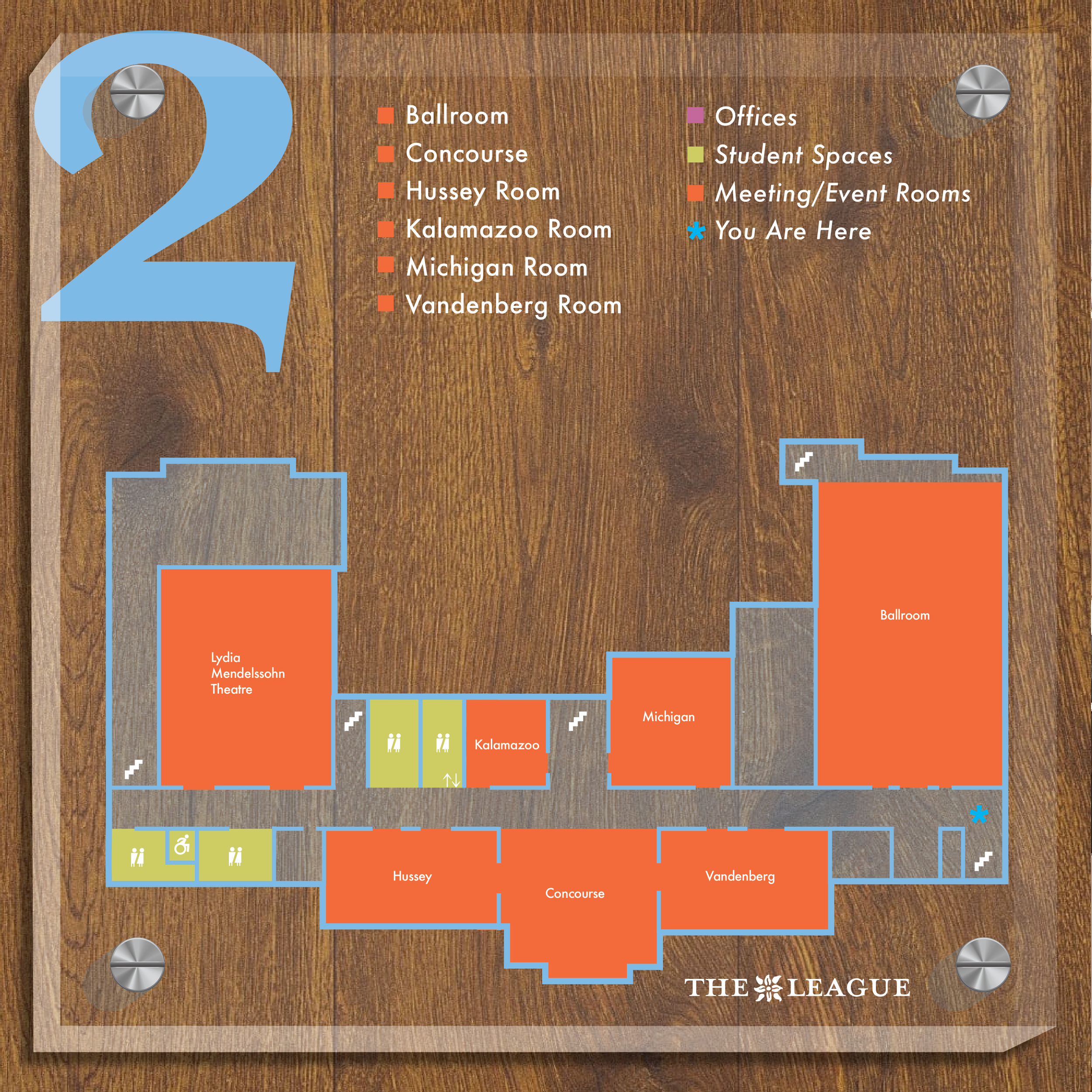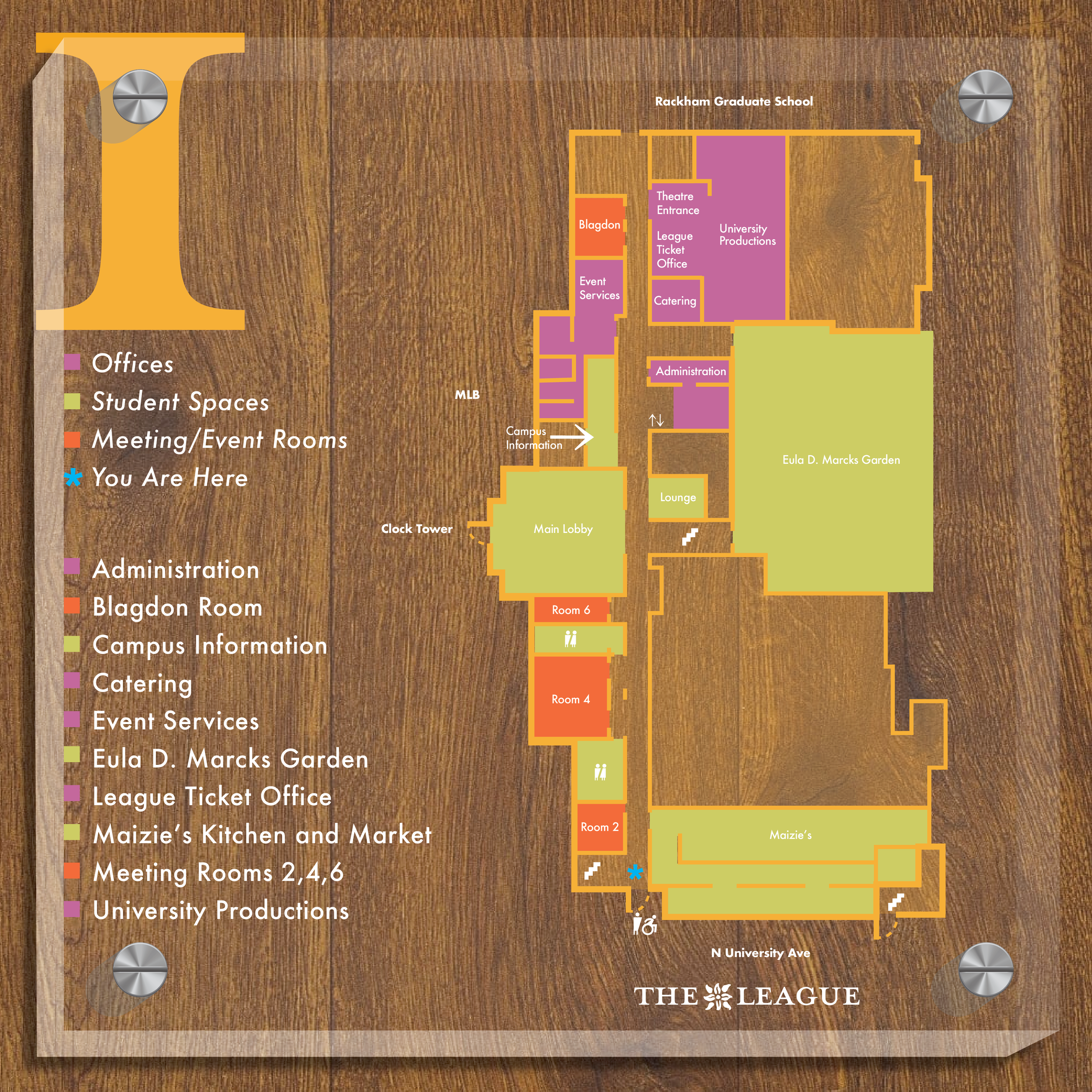 The purpose of this project was to design a visual system for the Michigan League, an iconic university building on the central campus of the University of Michigan. By researching and understanding how to create designs that will aid visitors in navigating this complicated building, through identifying problems within the existing system, and after discerning prominent architectural and historical features of the space, I designed a comprehensive wayfinding system for the historical university building.
